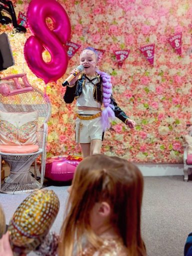 Your party host will teach all mini superstars a fun dance routine, each child will have the chance to take the mic to sing one of their favourite songs, then follows an awesome disco to show off their favourite dance moves, and a fun photoshoot with props in front of our fancy flower wall to finish!